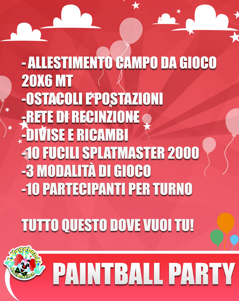 Installeremo nella location che deciderai tu un vero e proprio campo da battaglia con diversi ostacoli tra cui balle di fieno, piccole strutture di legno e altro ancora.Si utilizzeranno un marcatore (fucile) caricato a molla ed adatto ai bambini piccoli, sicuro, che spara palline di vernice colorata (atossica e lavabile) oltre alle protezioni (maschera e corpetto protettivi).Verranno formate 2 squadre composte da 5 bambini ciascuna , e si portanno scegliere 3 modalità di gioco diverse per dare spazio alla loro fantasia. Alla fine della festa rilasceremo un attestato di partecipazione da vero guerriero ad ogni bambino.