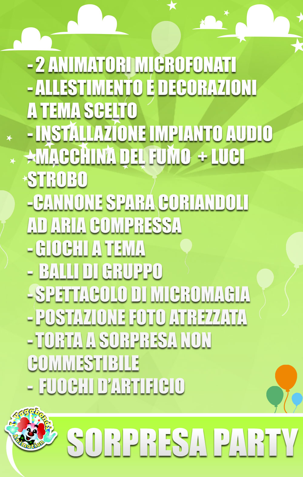 Musica, luci, giochi e balli; macchina del fumo e cannone spara coriandoli renderanno l' atmosfera divertente colorata e scoppiettante.
